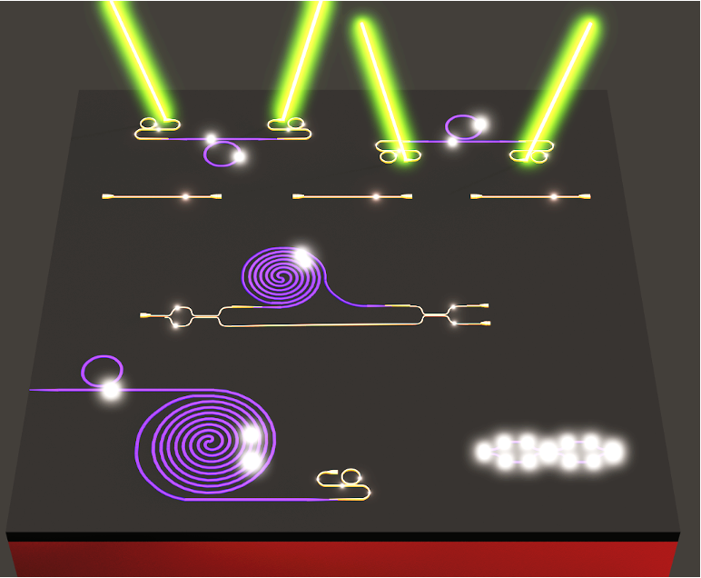 In our Integrated Photonics team, we specialize in designing and fabricating integrated photonic devices across a range of material platforms, including amorphous silicon carbide, lithium niobate, silicon nitride, and silicon-on-insulator, for wavelengths spanning from the visible to the mid-infrared. A key area of focus is the deterministic integration of single-photon sources based on nanowires and superconducting single-photon detectors for quantum photonic experiments. By combining these materials on a single chip, we can leverage various optical effects. For example, integrating high-quality amorphous silicon carbide (known for strong third-order non-linearities) with lithium niobate (a second-order non-linear platform) enables heat-free, fast electro-optical modulation. This allows for the generation of entangled photon pairs, a key component for optical computing and quantum experiments. Another notable combination involves amorphous silicon carbide and silicon nitride, which provide high thermo-optic modulation and low-loss delay lines. Additionally, we’ve developed silicon dioxide claddings that allow precise tuning of thermo-optic properties on a single chip, enabling widely tunable and low-power integrated photonic circuits.